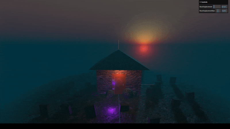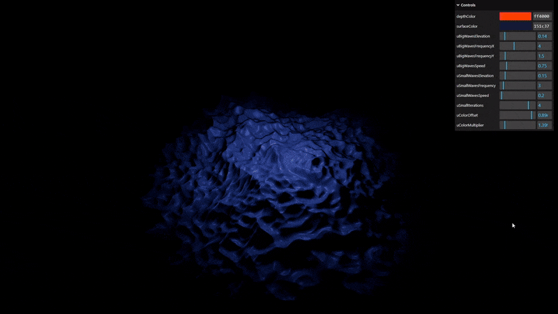 A Three.js project showcasing custom-built WebGL point and directional light shaders applied to a sea that is created from a plane geometry and tweaked with WebGL vertex shader.